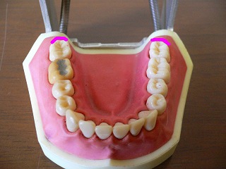 奥歯で磨き残しの多い場所はココ。(ピンクのマーキング。)