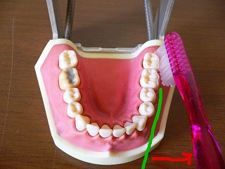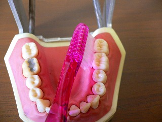 この前歯の磨き方は、歯ブラシを「鉛筆を持つように持つ」持ち方ではやりずらいので、柄を握るように、御自分の持ちやすい方法で持って下さい。