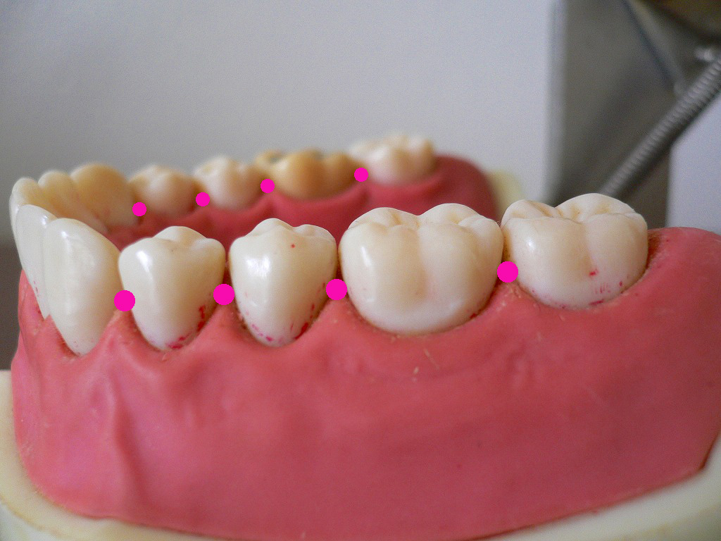 歯と歯の隙間は歯の上(噛み合わせ)の方より、歯の根本(ピンクの○のところ)の方が、より広く空いています。ここに歯間ブラシを入れます。