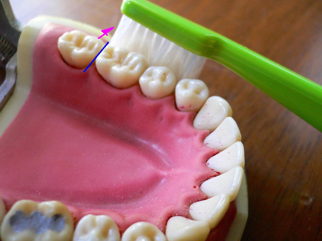 歯ブラシの毛先が、歯と歯ぐきの境目から、歯ぐきのほうに侵入しようと、歯面にくっついている歯垢に当たり、
