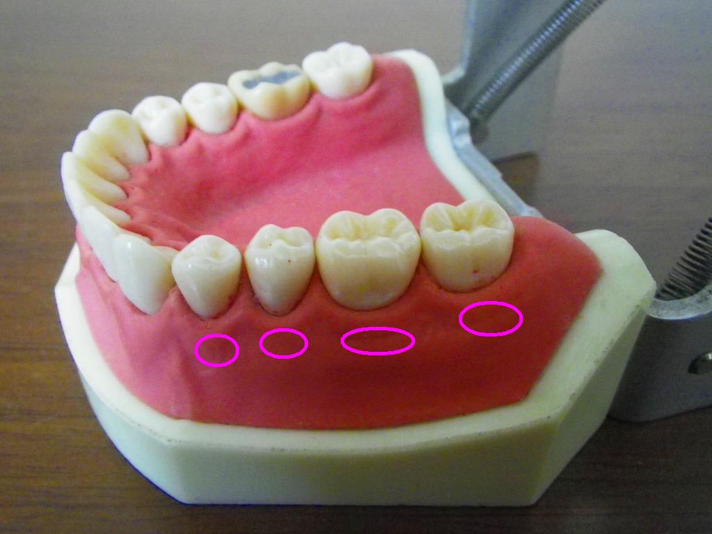 (ピンクの丸の一帯あたり、ちょうど、歯ぐきの下で歯槽骨が溶けていると思われる辺り)